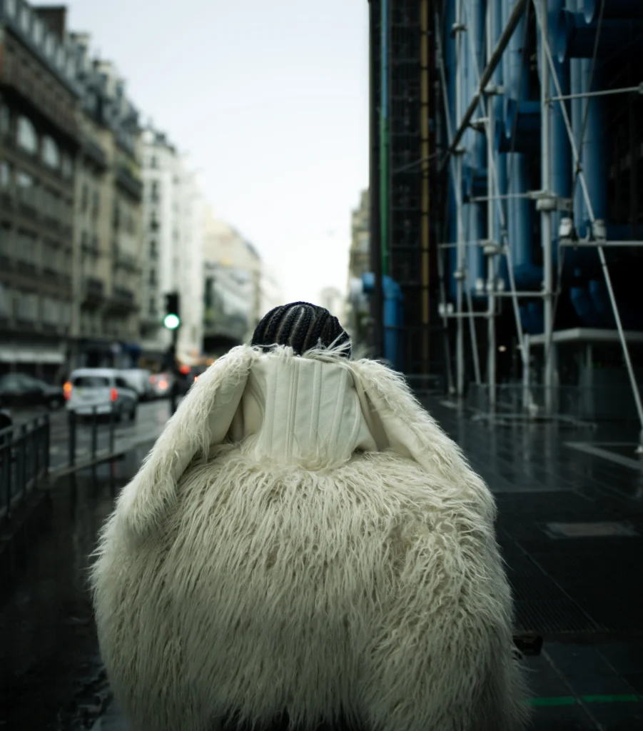 Le voici arrivé à Beaubourg, la cadence de ses pas s’intensifie. Soucieux d’arriver à l’heure à son défilé, Samir est néanmoins concentré. Rien pour le perturber, pas même la passante qui hurle à en perdre la voix : “Wouaaah il a un super manteau !”. Celui-ci est accueilli par un concert d’éclairs provoqué par un nuage noir de photographes prêts à immortaliser le passage de l’homme à la fourrure crème. Quelques poses photo s’imposent. À peine le temps pour nous de reprendre notre respiration, notre influenceur mode est déjà dans la queue. Son bracelet d’invitation en main, il nous enjoint d’un signe à le suivre. Aucune chance de le rattraper, nous le perdons de vue. L’escalator l’emporte.